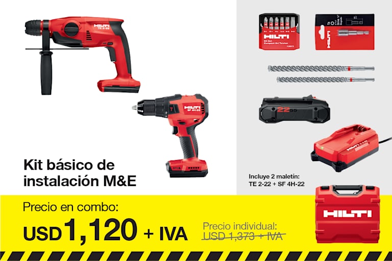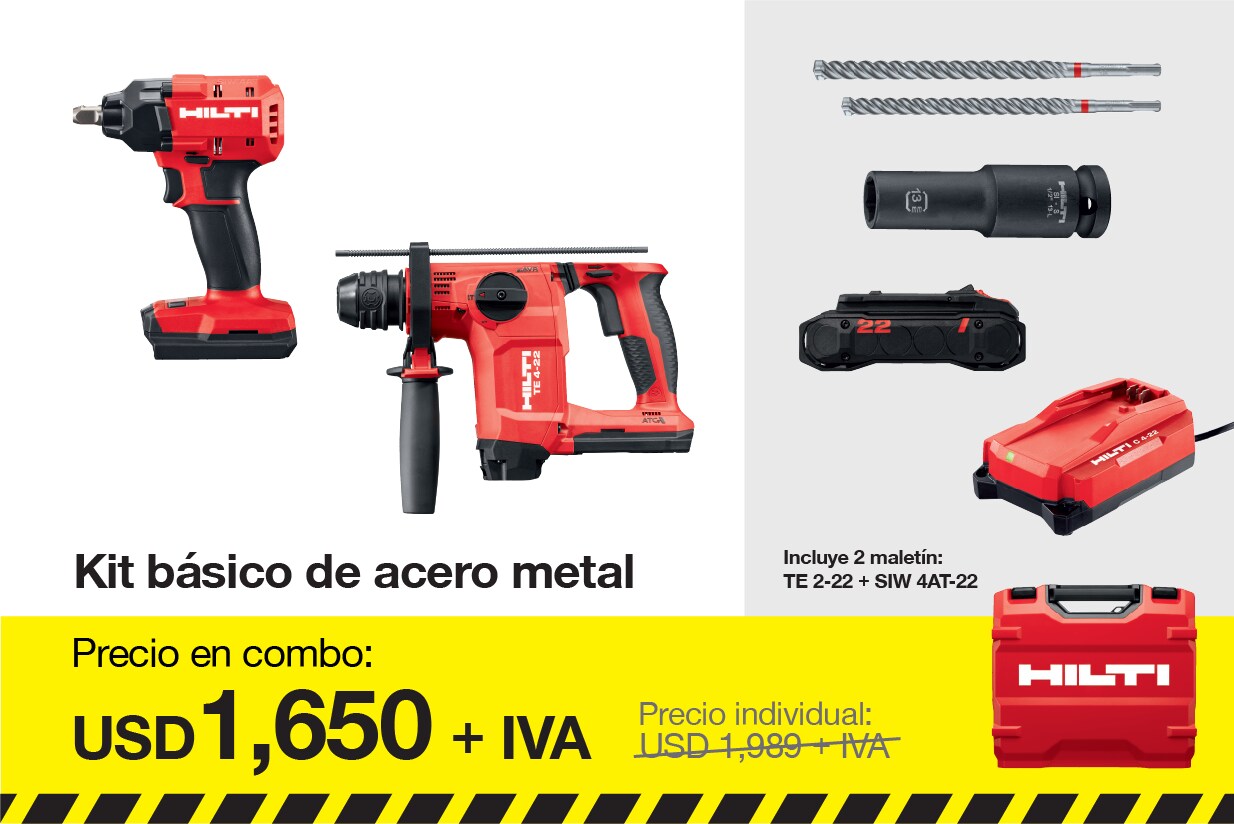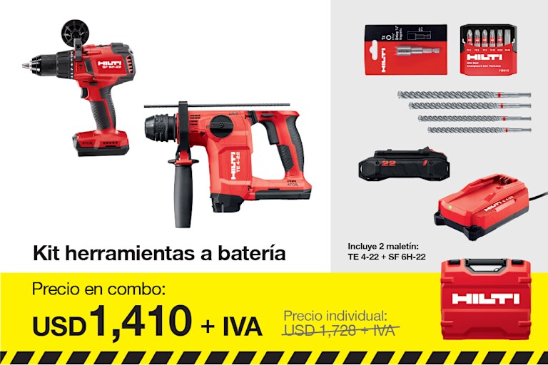 Incluye 1x Martillo perfor. a batería TE 4-22 (03), 1x Hilti Grease, 1x Maletín TE 4-22 cpl, 1x Atorn. tal. perc. bat. SF 6H-22 03, 1x Maletín SF 6H-22 cpl, 1x Cargador de batería C 4-22 02 220-240V, 1x Broca para taladro TE-CX 6/17, 1x Broca para taladro TE-CX 8/22, 1x Broca para taladro TE-CX 10/17, 2x Broca para taladro TE-CX 12/17, 1x Juego de puntas S-BSC UNI 50/2" T (6) Bulk, 1x Adaptador para puntas S-BH M 75/3", 2x Batería B 22-85 Li-ion