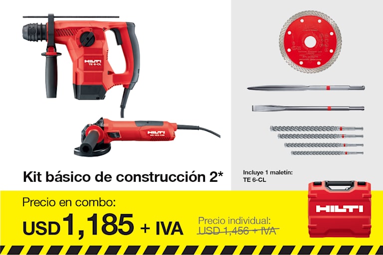 Incluye 1x Martillo perforador TE 6-CL 220V ARG, 1x Hilti Grease, 1x Maletín TE 6-CL cpl, 1x Amoladora angular AG 125-13S 220V, 1x Llave, 1x Perno roscado, 1x Empuñadura lateral, 1x Escudo EU conj., 1x Cubierta de protección 125-P88 cpl, 1x Cubierta de protection frontal 125, 1x Tuerca, 1x Broca para taladro TE-CX 6/17, 1x Broca para taladro TE-CX 8/22, 1x Broca para taladro TE-CX 10/17, 1x Broca para taladro TE-CX 12/17, 1x Disco de corte DC-D SPX 115 (6) porcelan, 1x Cincel puntero TE-CX SM 25, 1x Escoplo TE-CX FM 25