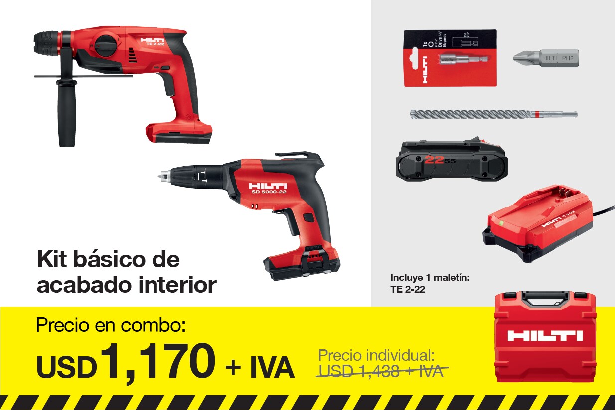 Incluye 1x Martillo perfor. a batería TE 2-22 cpl, 1x Hilti Grease, 1x Maletín TE 2-22 cpl, 1x Atorn. tabique seco a bat. SD 5000-22 ROW, 1x Punta S-B PH2 25/1" IF
