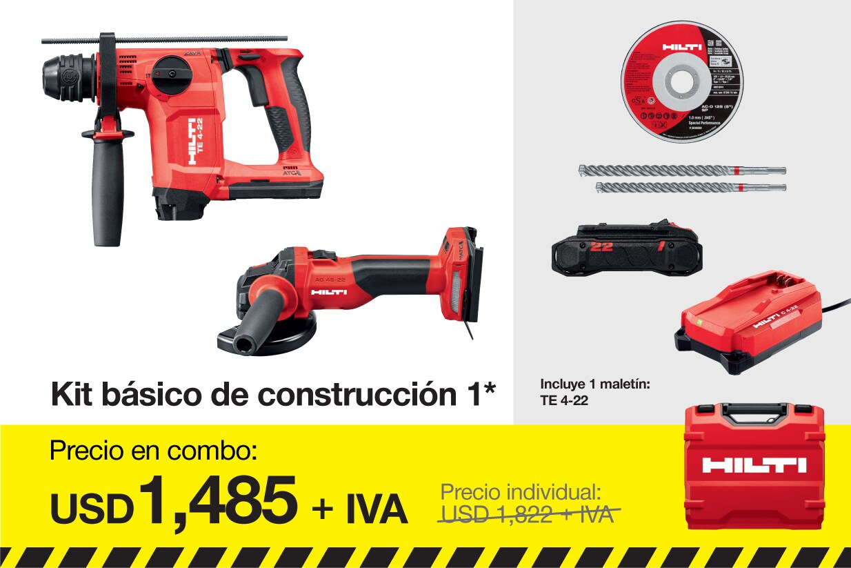 Incluye 1x Martillo perfor. a batería TE 4-22 (03), 1x Hilti Grease, 1x Maletín TE 4-22 cpl, 1x Amoladora angular a batería AG 4S-22-4.5, 1x Llave de montaje M14 / 5/8", 1x Escudo Ø 45 / 5/8", 1x Perno roscado, 1x Empuñadura lateral, 1x Cubierta de protección Ø115, 1x Tuerca, 1x Cargador de batería C 4-22 02 220-240V, 25x Disco de corte AC-D SP 125x1.6, 1x Broca para taladro TE-CX 8/22, 1x Broca para taladro TE-CX 10/17, 2x Batería B 22-85 Li-ion